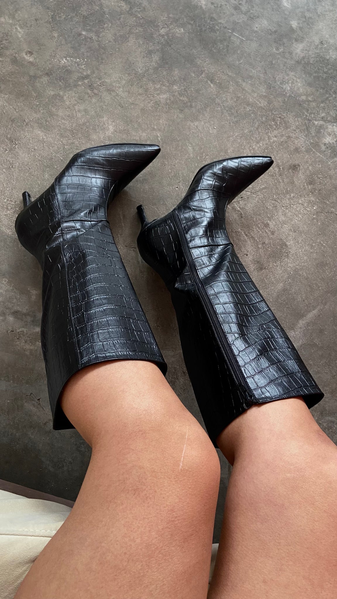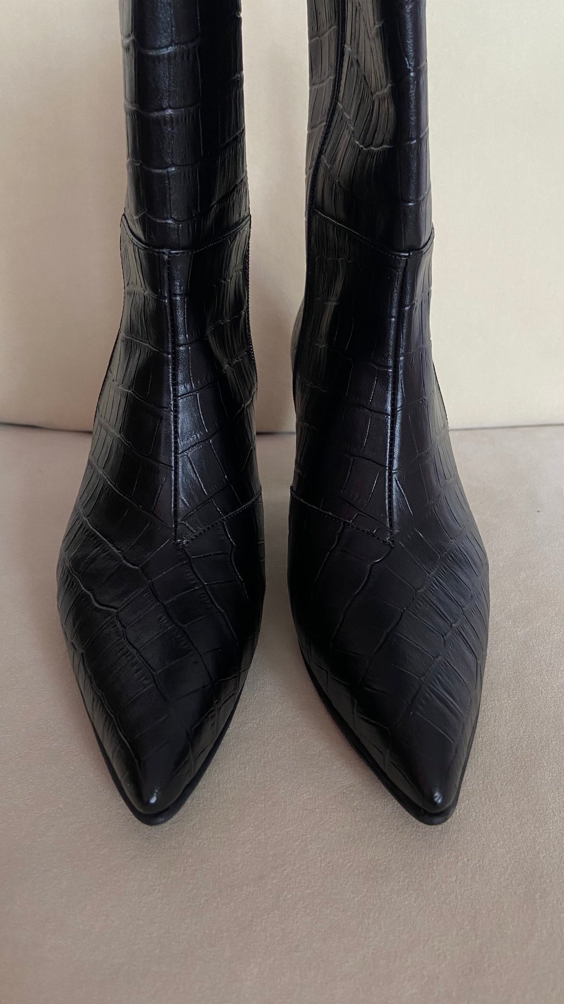 Las botas largas sofisticadas tipo zara que necesitabas! El diseño del taco lo hace todo✨ El color y la textura que buscabas todo en uno! El cuero cuenta con un efecto hermoso texturizado tipo croco y semibrilloso, CUERO DE EDICIÓN LIMITADA.
